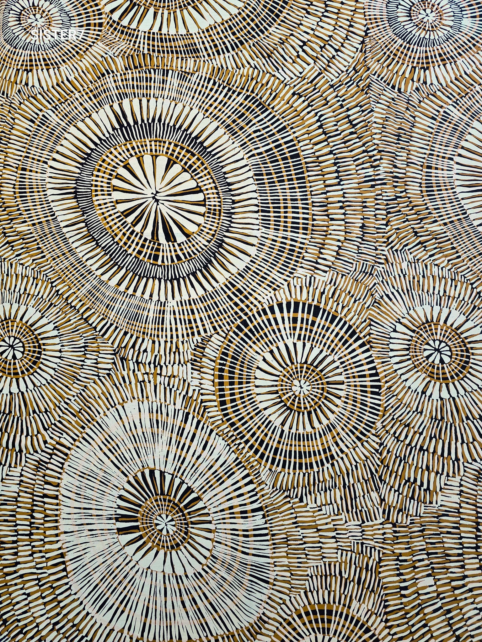 "The ancestral spirits can take the form of fog and chase uninitiated strangers that come into this sacred home country area. Her design illustrates as such the movement of the fog, her family’s relation to the land; where the ancestor spirits protects her and her family but can threatens outsiders. The title Fog Dreaming refers to this specific geographical site, created in the dreamtime and the ownership of the area is transferred within the artist’s kinship group"
