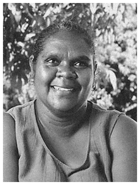 The fog at Marringarr "This is my grandmother’s Dreaming. Near the Moyle River there is a place called Marrengarr where the fog comes out of holes in the ground near the station house. This print shows these holes in the centre of the circles. The different layers around the circles are the fog spreading and floating over the land. My design captures both the movement of the fog and the spiritual danger associated with coming into contact with the fog.”